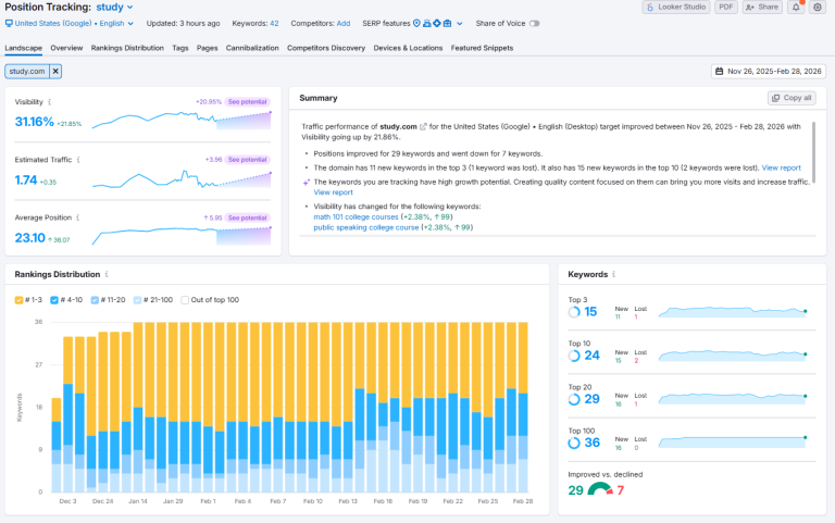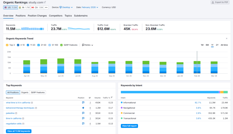 Overall, Study.com demonstrates steady SEO growth and strong keyword expansion, while competing closely with platforms like Coursera, which recorded a 23.1% visibility increase.