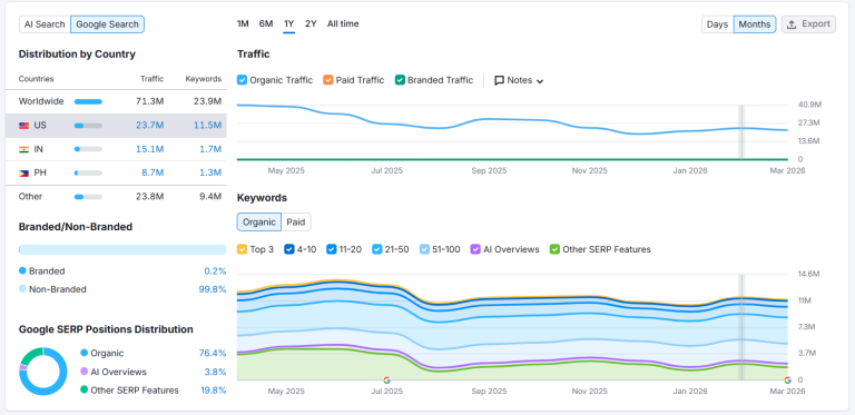 From an SEO perspective, the site ranks for over 11.5 million keywords and generates around 23.7 million monthly organic visits, with more than 92% coming from non-branded searches. In the United States (Google, Desktop), visibility increased by 21.86% between November 26, 2025 and February 28, 2026. During this period, 29 keywords improved in ranking, while only 7 declined. The site also gained 11 new keywords in the top 3 and 15 new keywords in the top 10, showing stronger SERP presence.